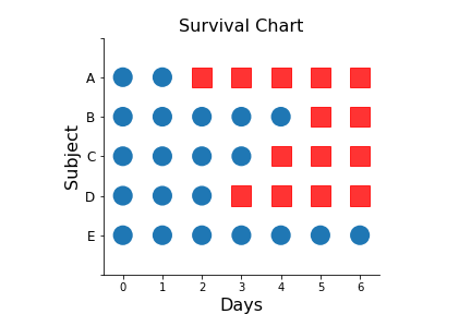 Importantly, survival is a one-way street --- once a subject is dead, then that subject cannot return to the experiment. This is important because survival analysis is also applied to component-failure or other topics where this fact is not so obvious. The following chart shows the survival status of each of the subjects for all seven days. The blue circles indicate that the subject is alive and the red squares indicate death of the subject.